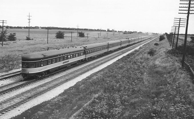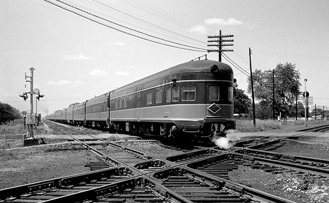 Parlor OBS 3310 is seen on the “Daylight” northbound at Kankakee, IL Note the top light is actually a white headlight and used on the back-up move to access the station at Springfield. The “Daylight” made a morning departure from Chicago to St. Louis and returned from St. Louis in the afternoon. The train was discontinued in 1958.
