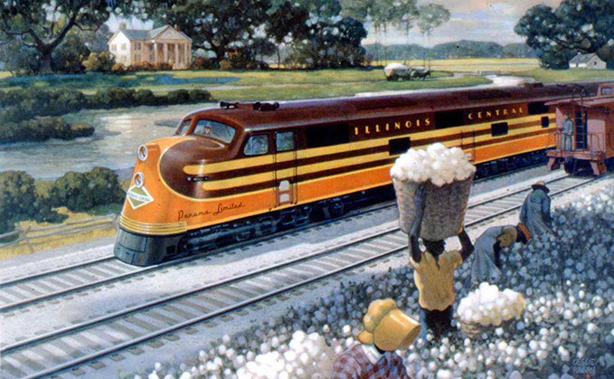 The Illinois Central utilized this painting for its 1947 promotional calendar showing the “Panama Limited” passing a plantation and a freight train in Mississippi. Views from this era were colorful and depicted local industry, in this case cotton crops that were shipped on IC freight trains. We recognize that this view would be deemed socially insensitive by today's values and is shown for historic purposes only.