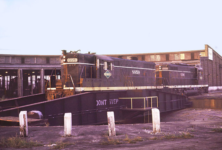 IC 8959 and 9206 are seen on the turntable at Johnston Yard Roundhouse in Memphis. October,1968.