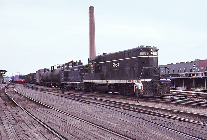 IC 8963 and 403 are seen on a freight transfer job, headed for North Yard, and passing train No 1, "City of New Orleans, at Central Station in July, 1968.