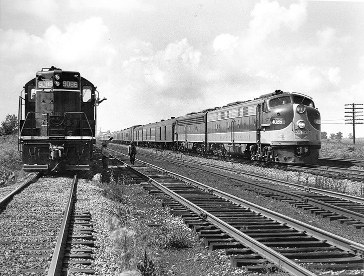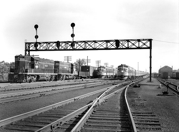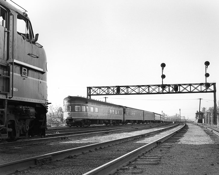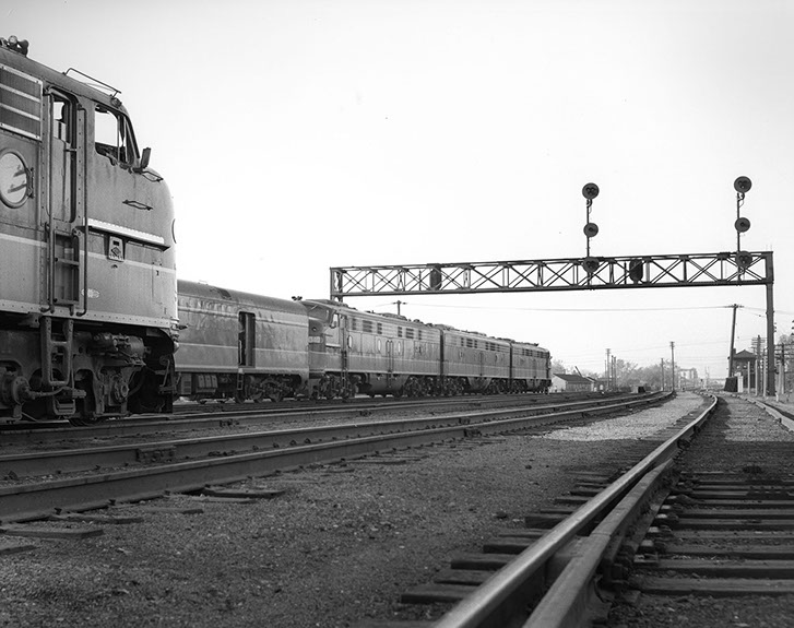 Highball No 52! The engineer on No 8 waits patiently as the “City of Miami”, on the left, overtakes the “Creole” and roars out of town on the final lap into Chicago. Only 127 miles remaining.