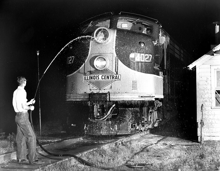 E Unit 4027 is receiving a brief wash down prior to resuming it's run on train No. 2, The City of New Orleans, at Champaign, Illinois. This view dates from July, 1959.