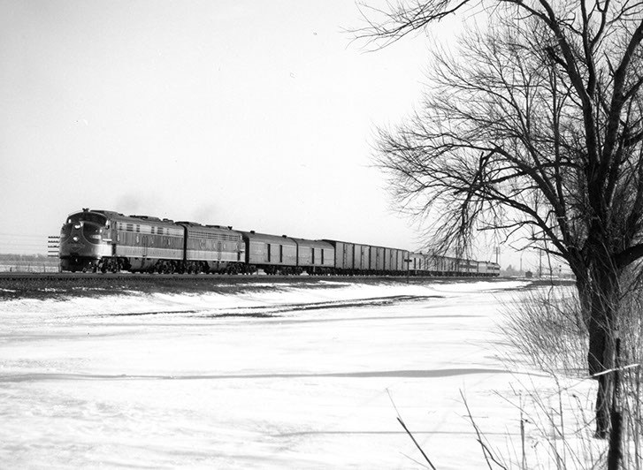 IC No 8 "Creole" is north of Champaign IL in this Dec, 1958 view. The train was always heavy with mail, express and baggage cars and is a hefty 16 cars long this date. Note the 5 Passenger Box cars, used in express service, which contained steam lines to heat the following passenger cars.