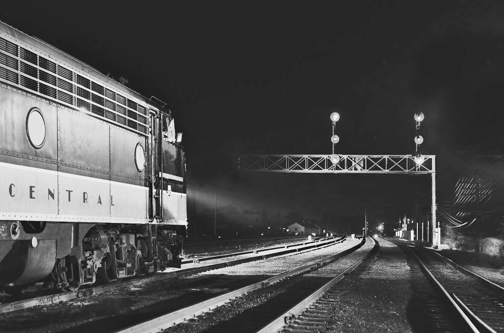 The “City of New Orleans” is northbound at the Champaign depot awaiting departure time. The train will be in Chicago in less than 2 hours. Note Champaign Tower in the distance, on the right. This magnificent photo dates from the late 1950s.