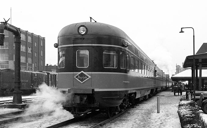Parlor OBS 3310 is seen on the “Daylight” northbound at Kankakee, IL Note the top light is actually a white headlight and used on the back-up move to access the station at Springfield. The “Daylight” made a morning departure from Chicago to St. Louis and returned from St. Louis in the afternoon. The train was discontinued in 1958.