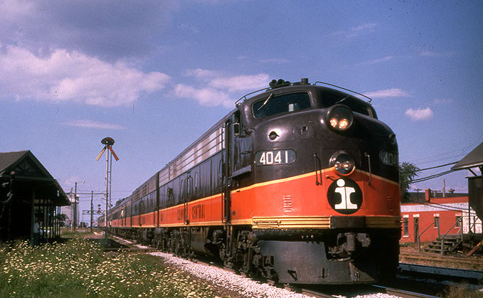 IC 4041 is seen on the “Shawnee”, leaving Gilman, IL on a Chicago to Carbondale, IL corridor train in August, 1969.