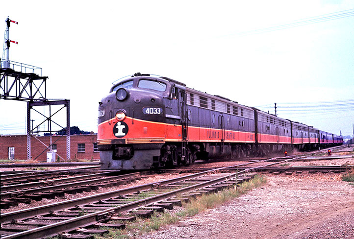 IC 4033, northbound Train 2 "City of New Orleans" is just south of Central Station at "IC Crossing". All trains stopped, then proceeded across the diamond with the Rock Island, Frisco and Missouri Pacific ailroads. On the left is a semaphore signal bridge used by these roads which entered Memphis on an east-west alignment. June, 1968