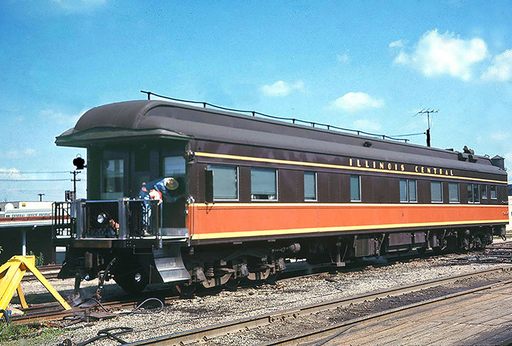 IC No 1, "City of New Orleans" is southbound on Track 10 at Central Station with flat ended "Club-Lounge Observation" car, either 3377 or 3378, on rear. Both of these Observation cars would eventually be acquired by Iowa Pacific and survive in present day.